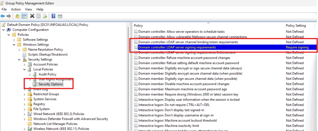 Computer Configuration → Policies → Security Settings → Security Options → Domain controller: LDAP Server Signing Requirements