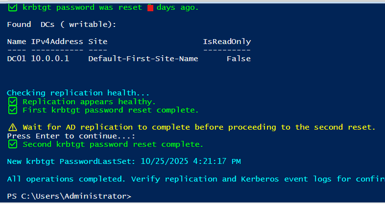 Write-Host "`nNew krbtgt PasswordLastSet:" $krbtgtUpdated.PasswordLastSet -ForegroundColor Cyan